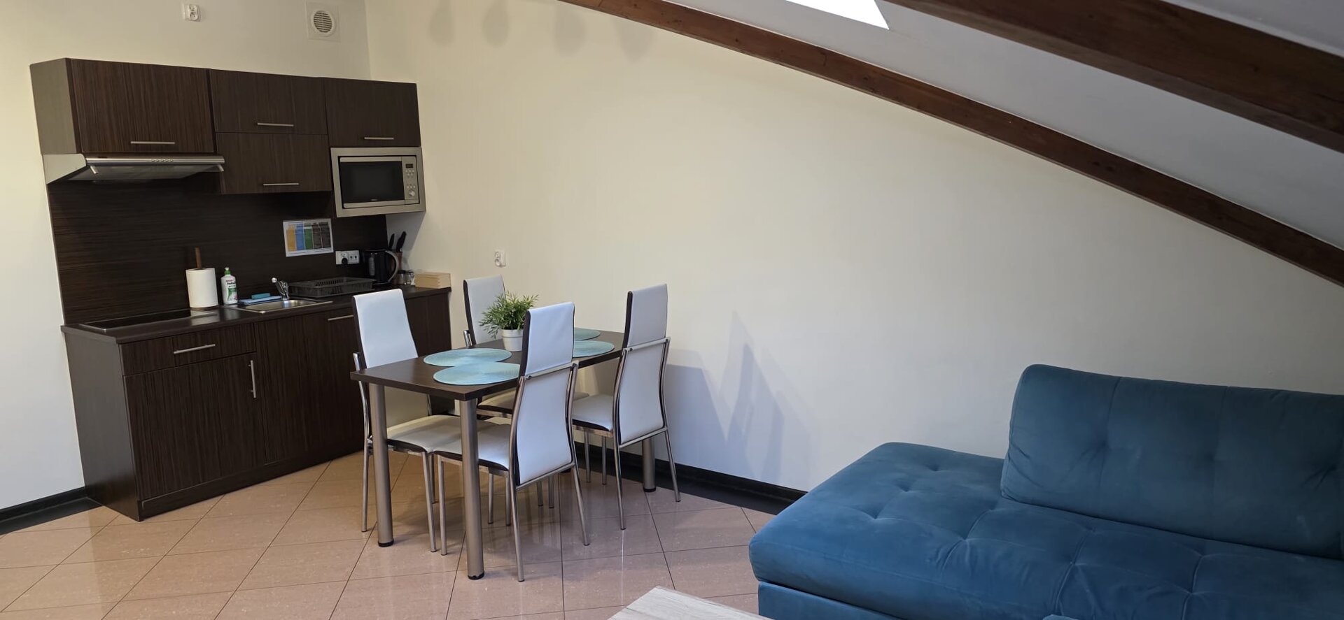 Do dyspozycji gości jest w pełni wyposażony aneks kuchenny, bezpłatna kawa, herbata, a także szybkie Wi-Fi.